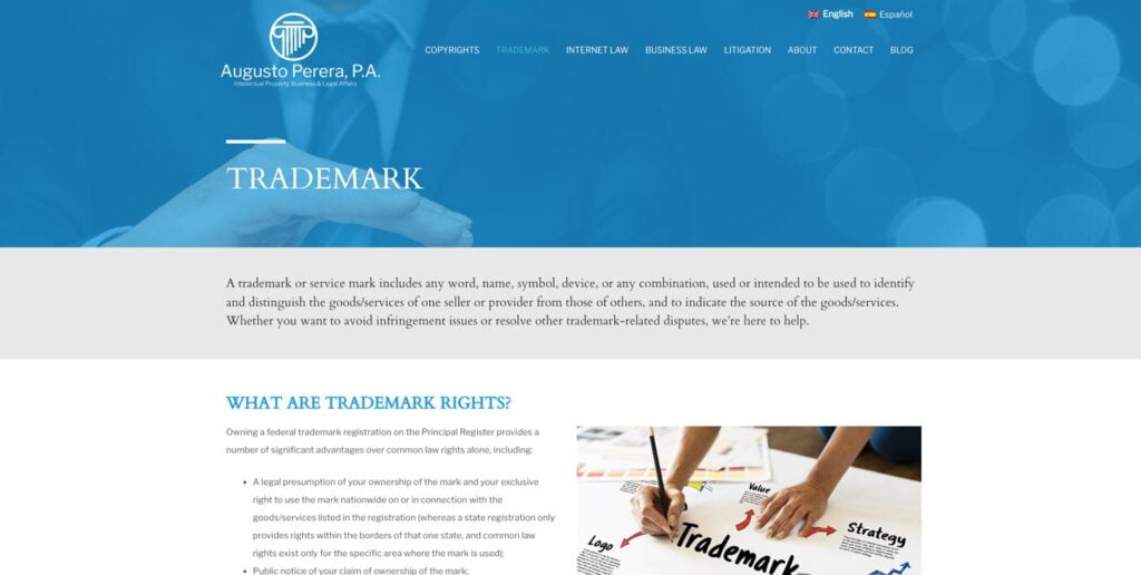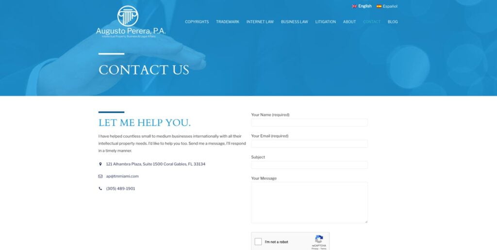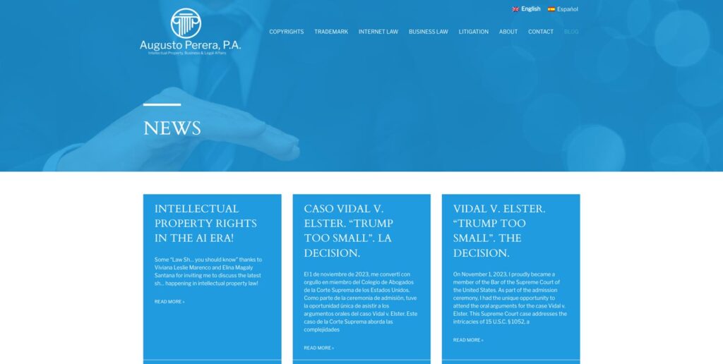 We partnered with Augusto Perera, PA, an esteemed intellectual property law firm in Coral Gables, Florida, to create a professional and informative multilingual website. The site showcases their expertise in copyrights, trademarks, business law, and internet law, and is available in both English and Spanish.